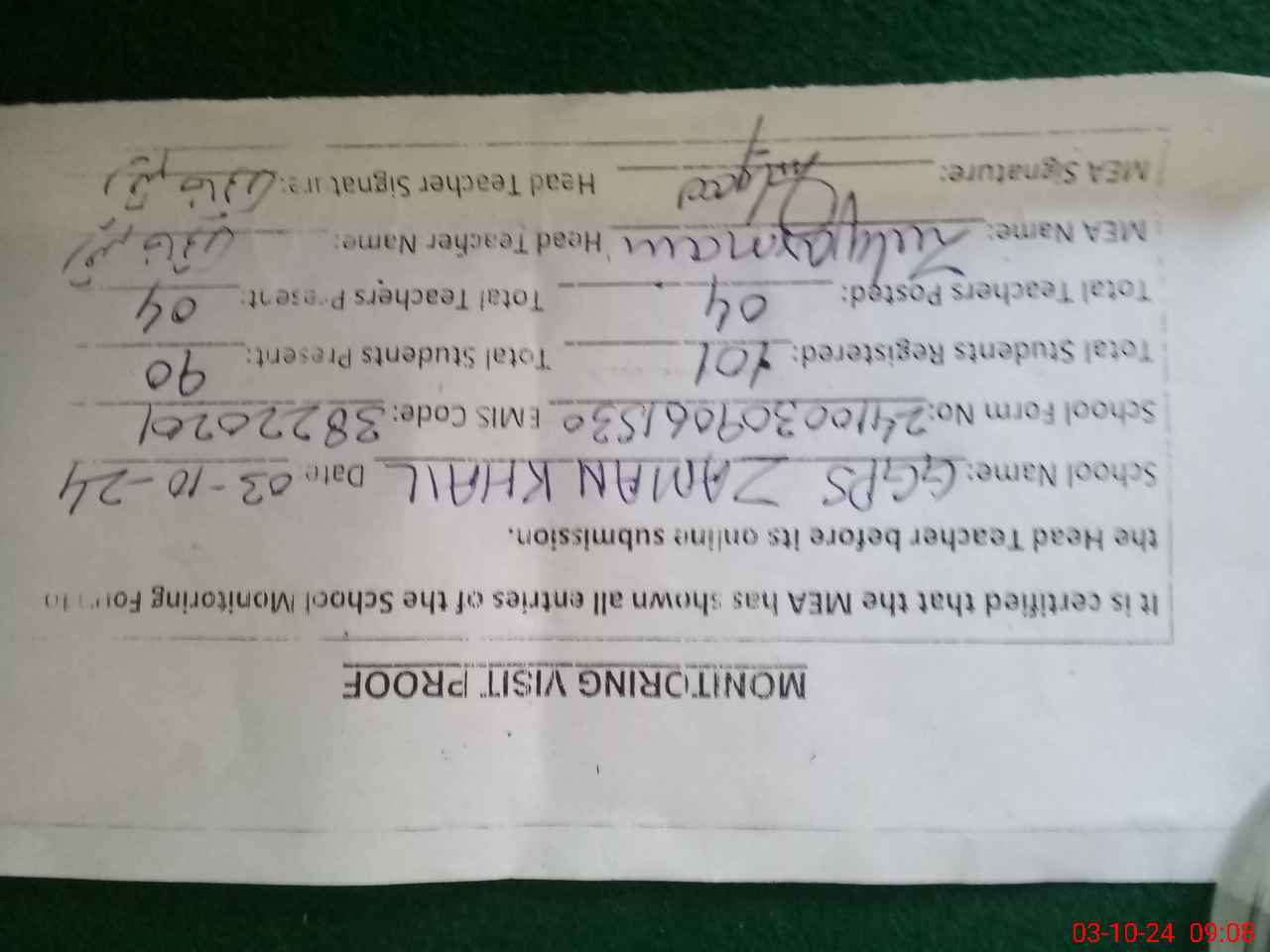 | Certified that this School was Inspected by the Undersigned MEA/DMO Today and the Information Stated Above is as Per Record. | |||||