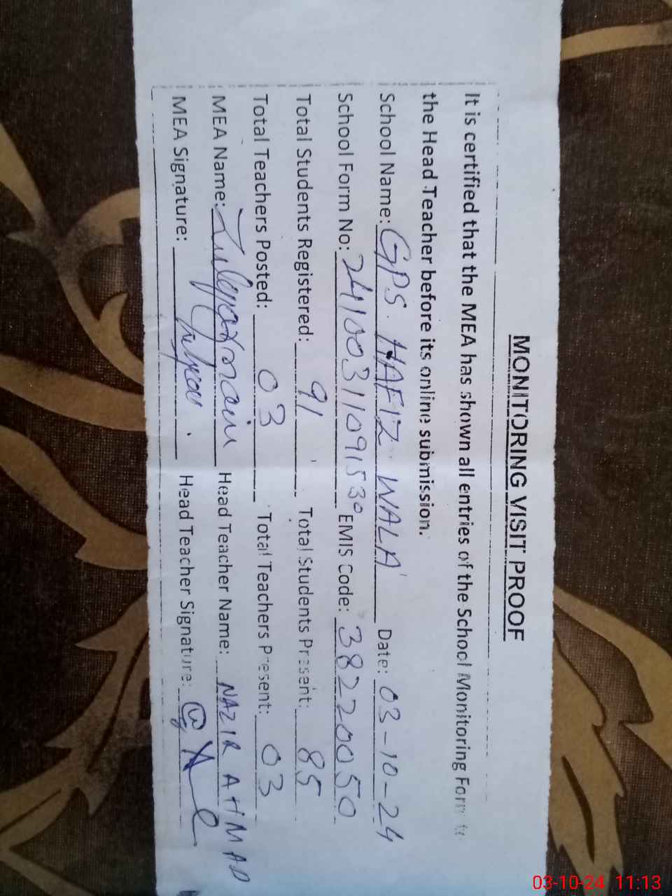 | EMIS Code: 38220050 | Name of School: GPS HAFIZ WALA | |||