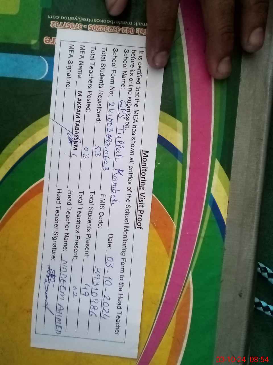 | EMIS Code: 39310986 | Name of School: GPS TULLAH KAMBOH | |||