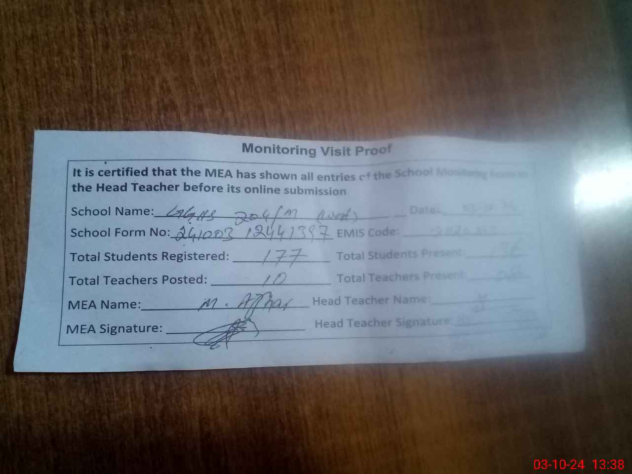 | Attendance Register | Head Teacher | MEA with School | Visit Proof |