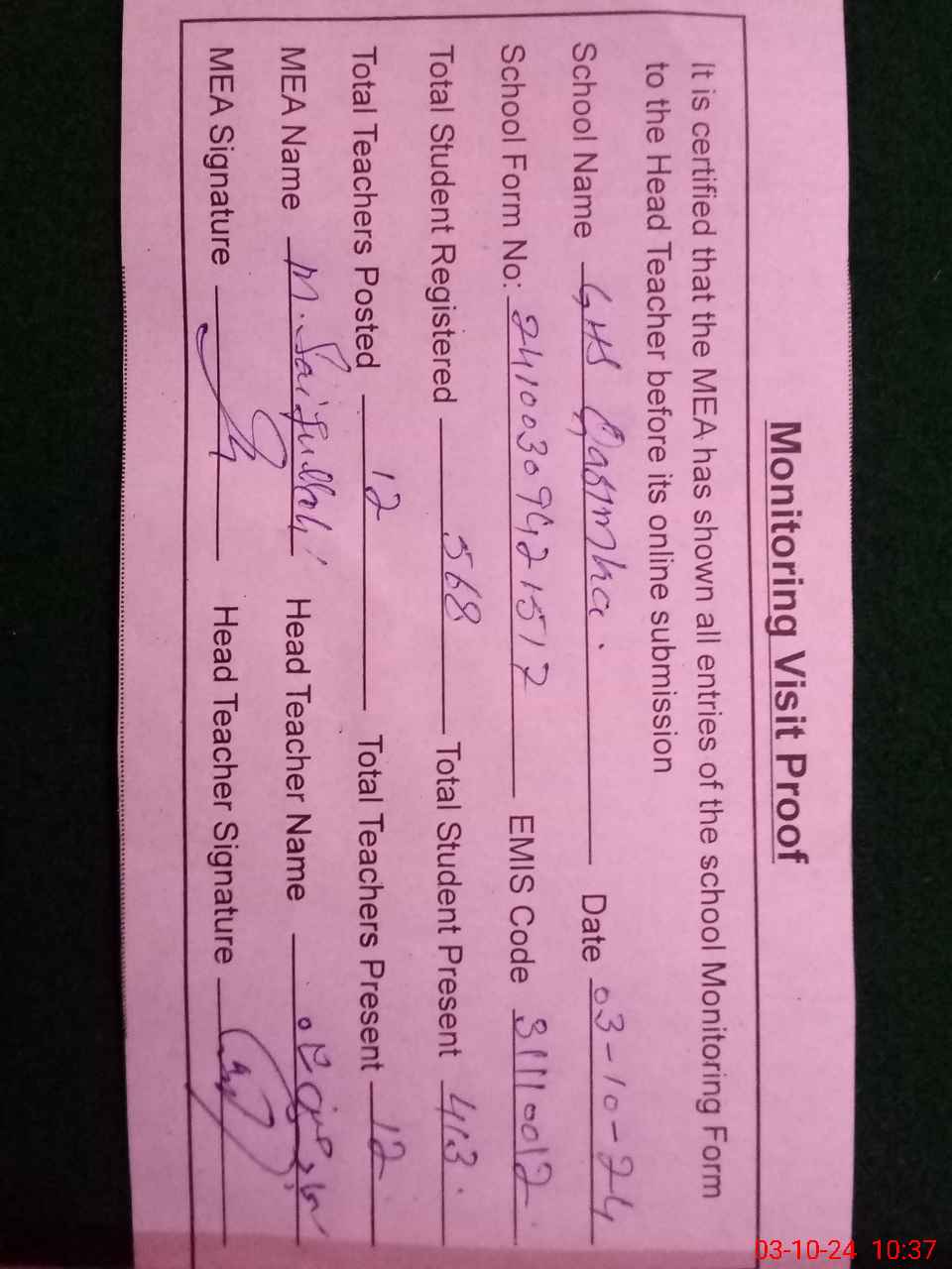 | Attendance Register | Head Teacher | MEA with School | Visit Proof |