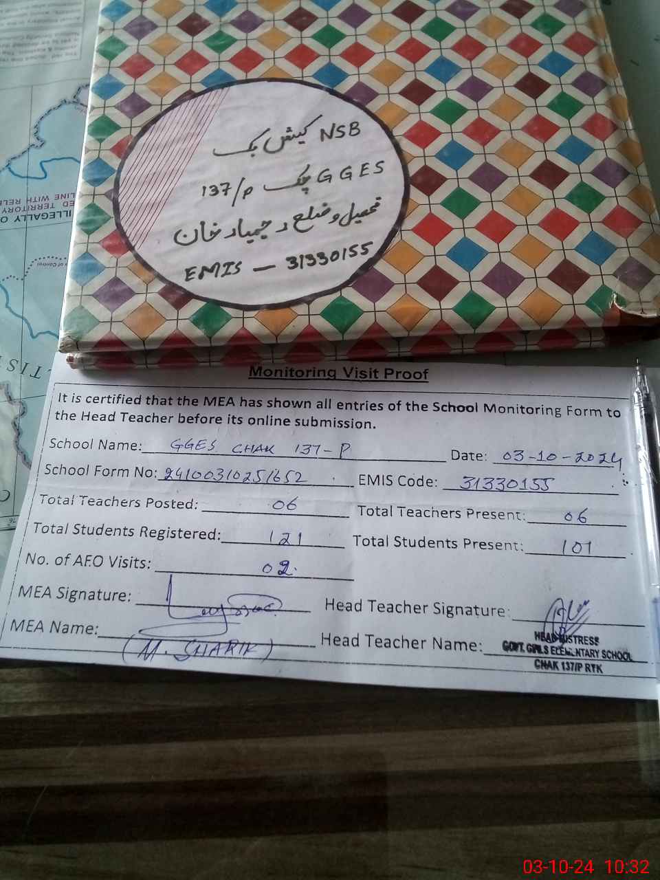 | EMIS Code: 31330155 | Name of School: GGES CHAK NO. 137/P | |||