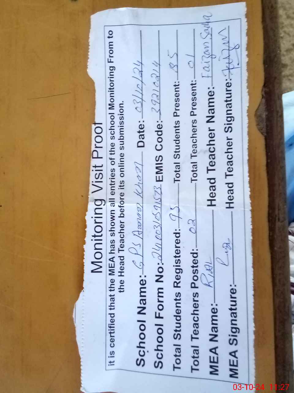 | Attendance Register | Head Teacher | MEA with School | Visit Proof |