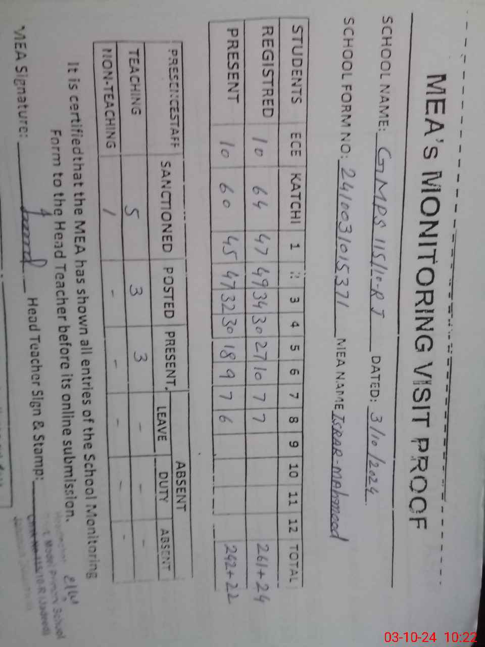 | Monitoring Date: 03-10-2024 | Start Time: 03-10-2024 09:13 AM | End Time: 03-10-2024 10:27 AM | Name of MEA: Is**** Me**** | |