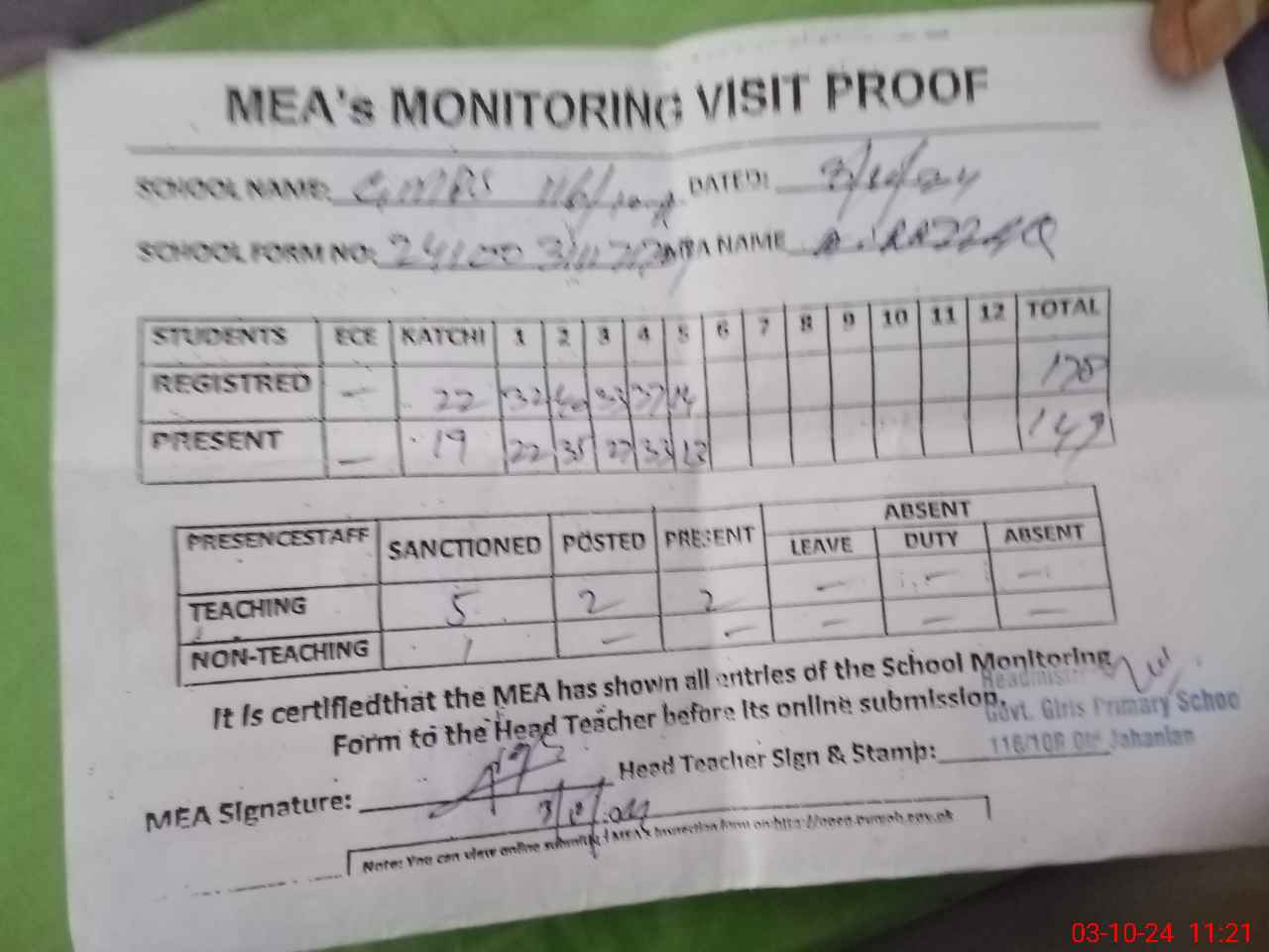 | Attendance Register | Head Teacher | MEA with School | Visit Proof |