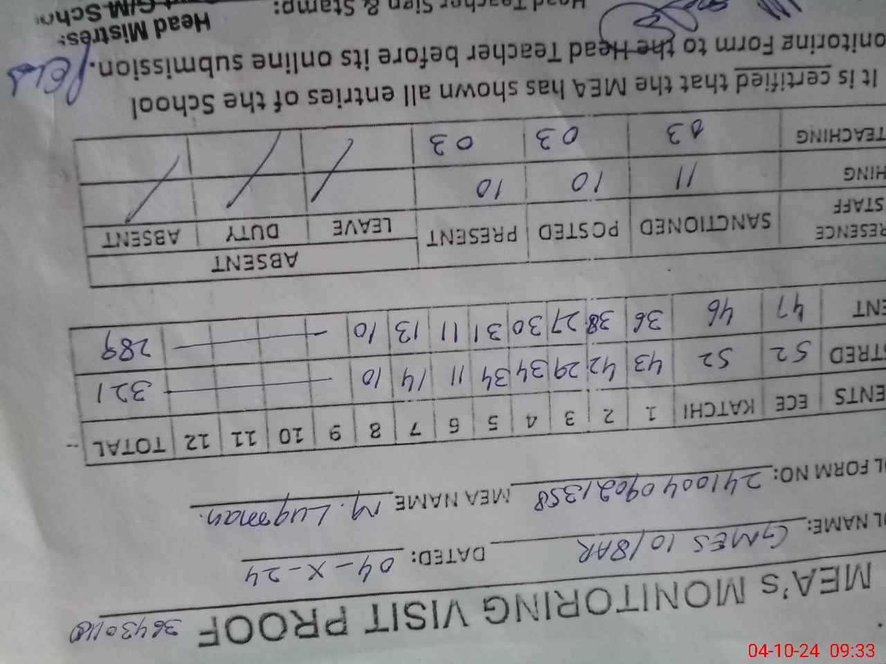 | Monitoring Date: 04-10-2024 | Start Time: 04-10-2024 08:37 AM | End Time: 04-10-2024 09:34 AM | Name of MEA: Mu**** Lu**** | |
