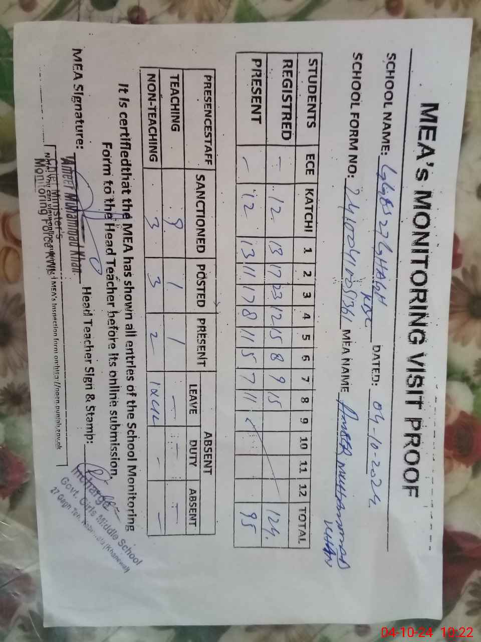 | Attendance Register | Head Teacher | MEA with School | Visit Proof |