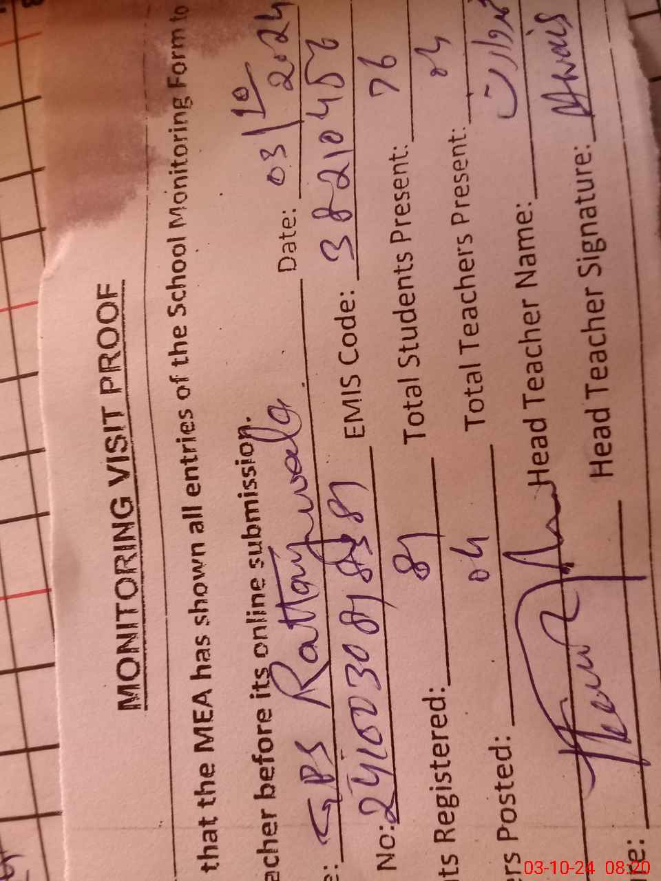 | Attendance Register | Head Teacher | MEA with School | Visit Proof |
