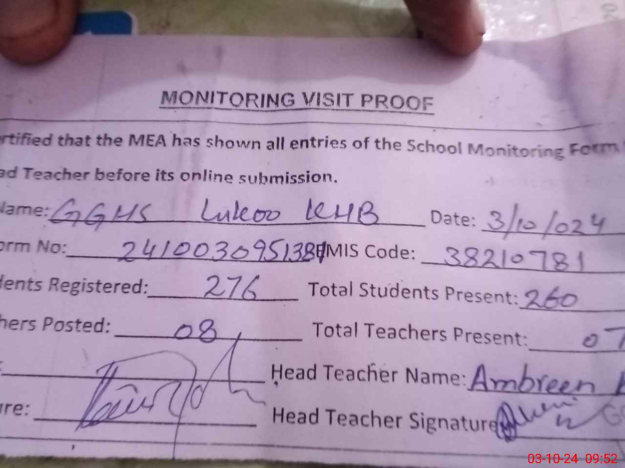 | Certified that this School was Inspected by the Undersigned MEA/DMO Today and the Information Stated Above is as Per Record. | |||||