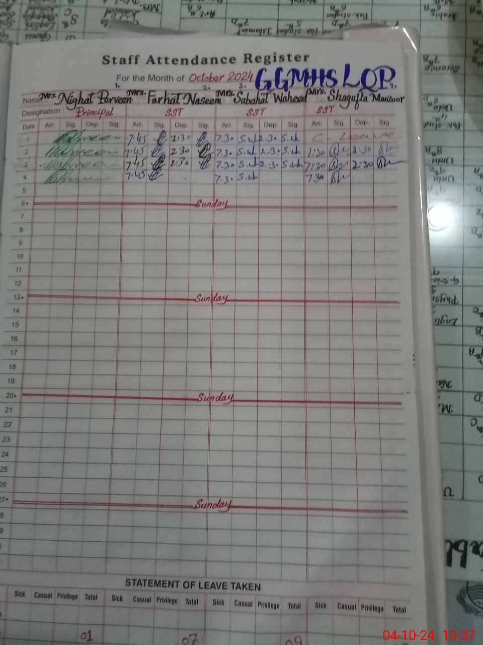 | Leave | Duty | Absent | Maternity | Medical | Ex- Pak |