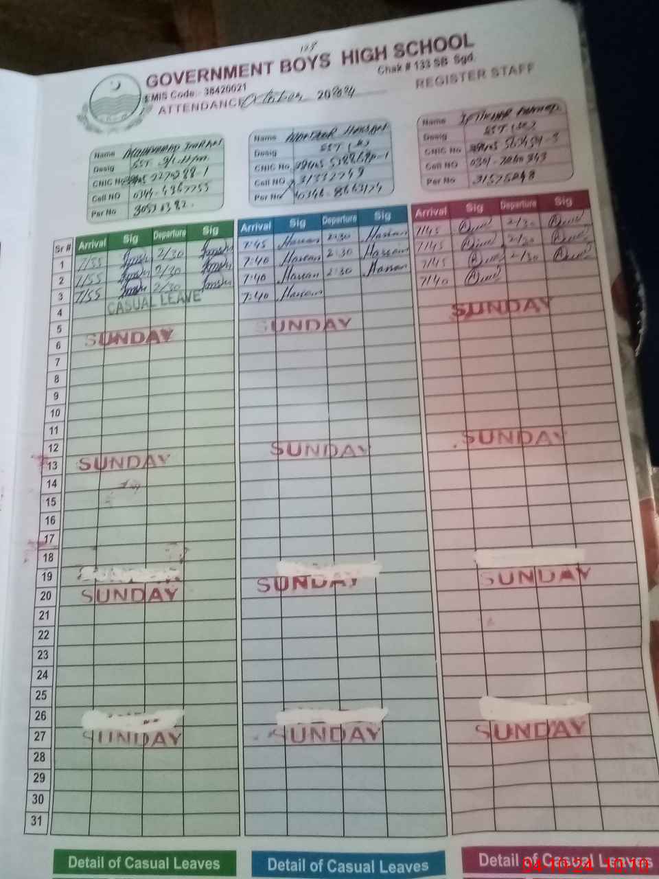 | CNIC | Full Name | Designation | R/C | Absence during last cal. month |