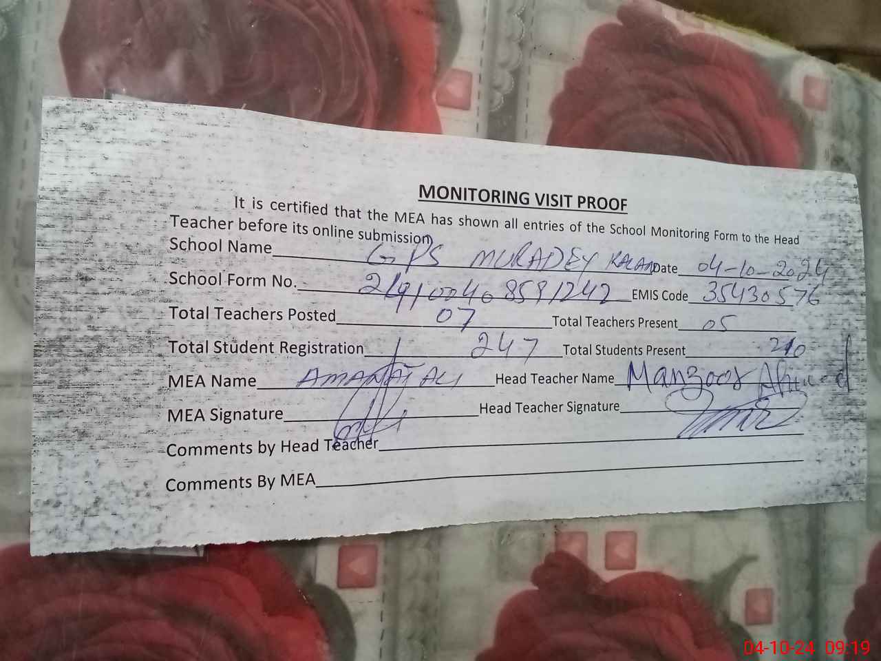 | Attendance Register | Head Teacher | MEA with School | Visit Proof |