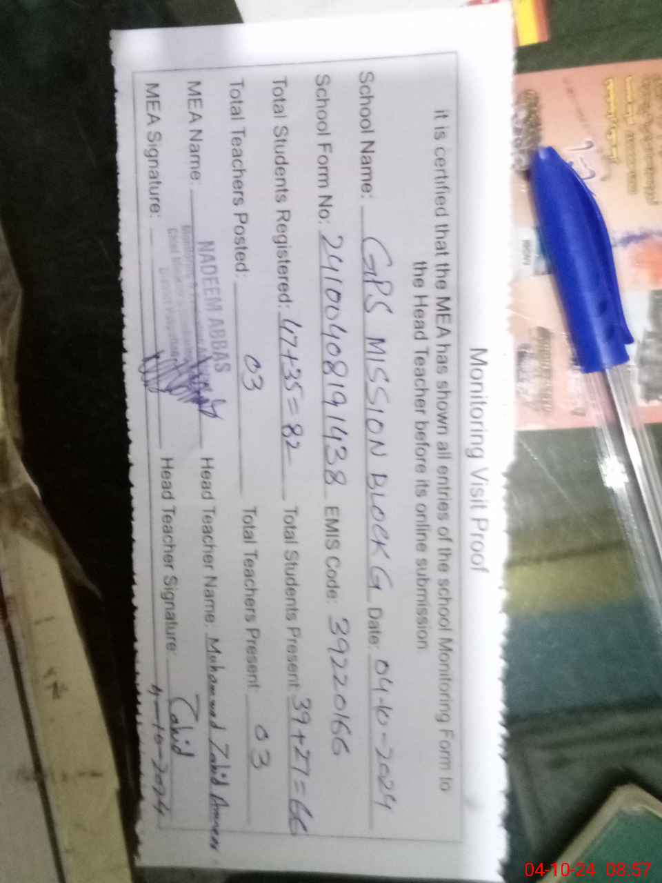 | EMIS Code: 39220166 | Name of School: GPS MISSION BLOCK G | |||