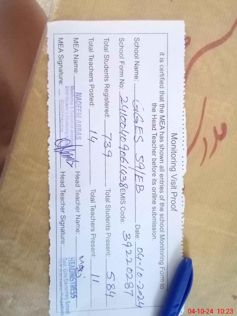 | Attendance Register | Head Teacher | MEA with School | Visit Proof |
