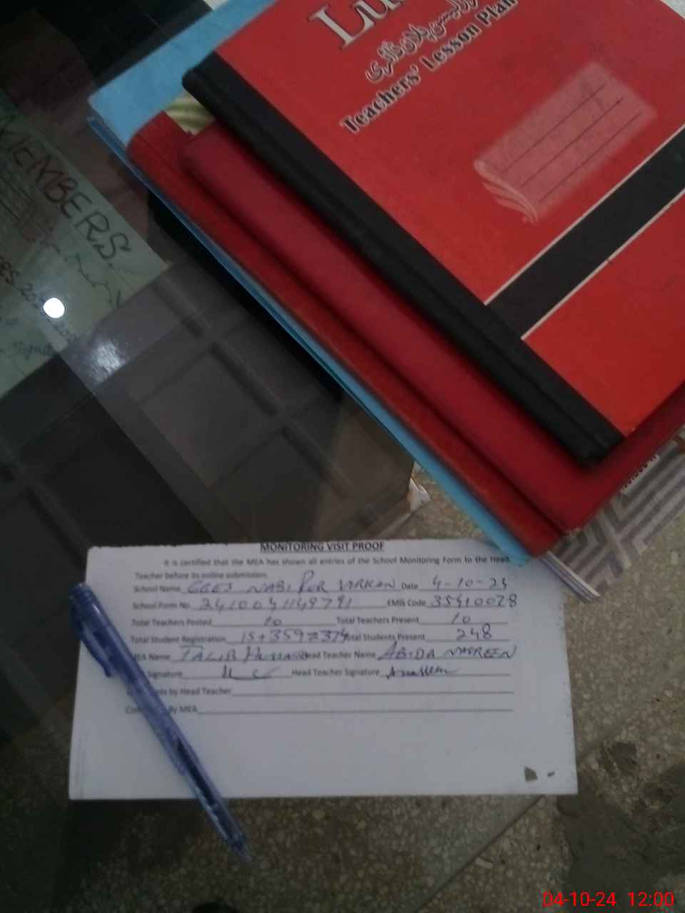 | Attendance Register | Head Teacher | MEA with School | Visit Proof |