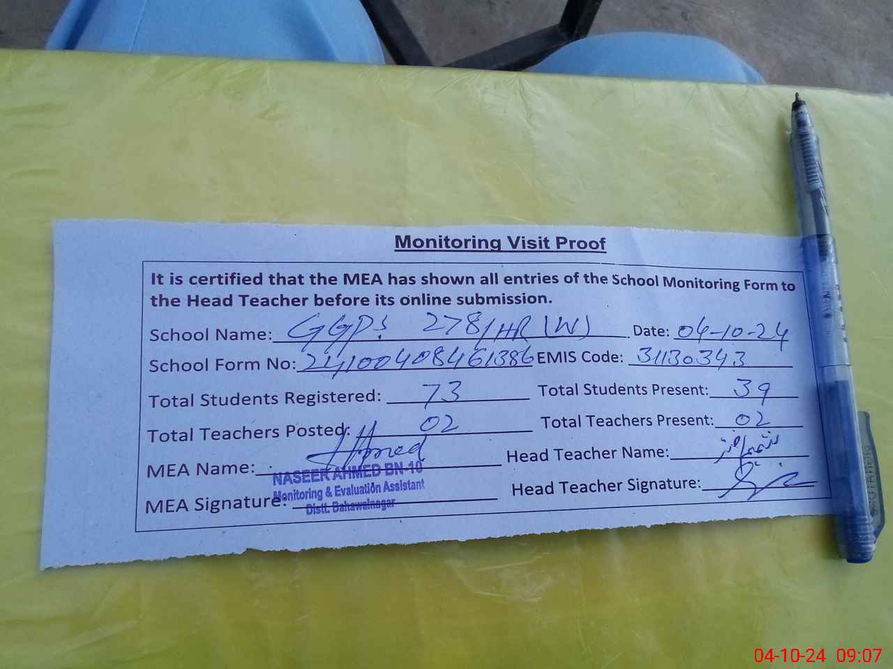 | EMIS Code: 31130343 | Name of School: GGPS CHAK NO 278 HR W | |||