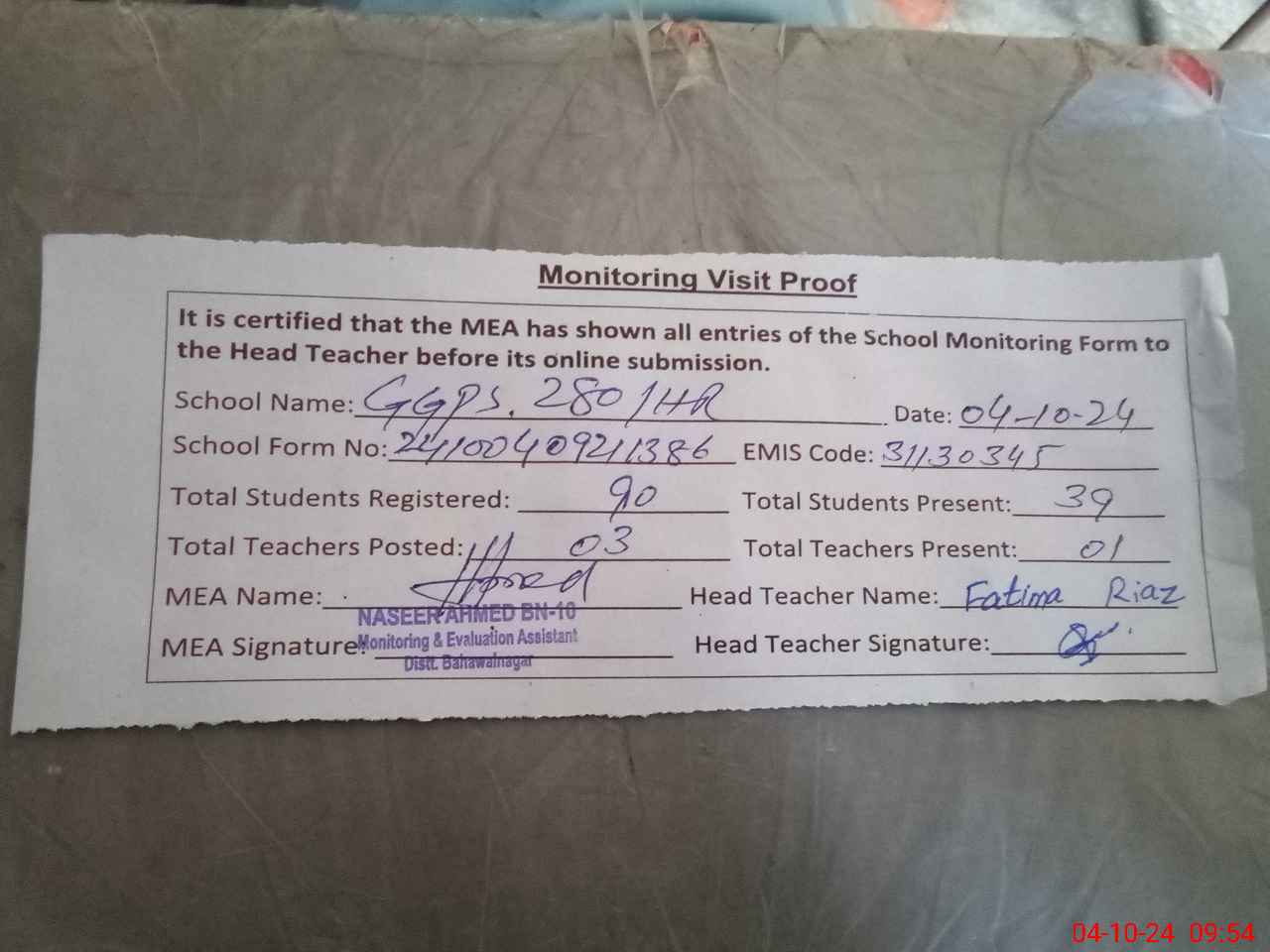 | Monitoring Date: 04-10-2024 | Start Time: 04-10-2024 09:21 AM | End Time: 04-10-2024 09:55 AM | Name of MEA: NA**** AH**** BN**** | |