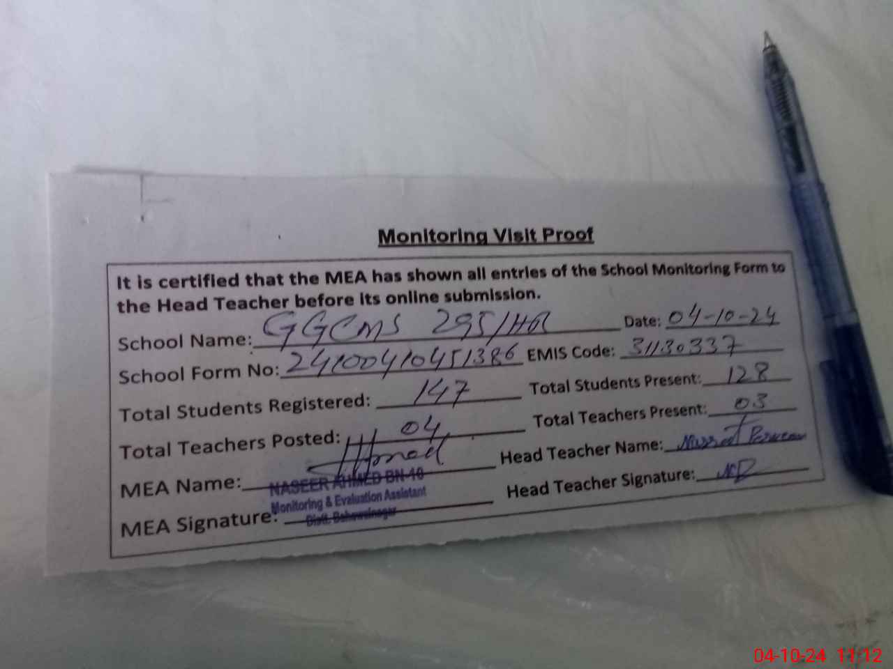 | EMIS Code: 31130337 | Name of School: GGCMS CHAK NO. 295 HR | |||