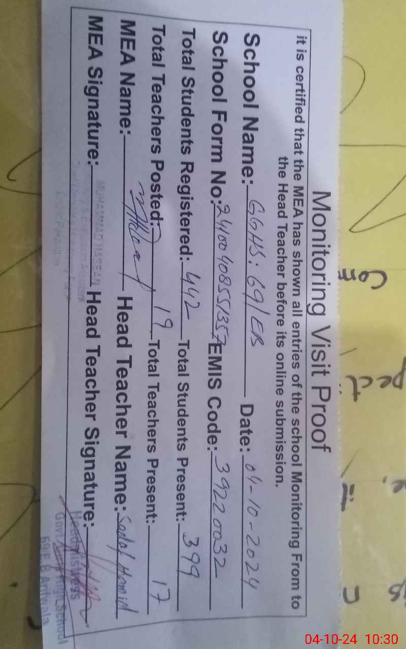 | EMIS Code: 39220032 | Name of School: GGHS 69 EB ARIF WALA | |||