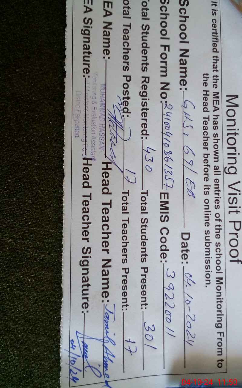 | EMIS Code: 39220011 | Name of School: GHS 69/EB ARIF WALA | |||