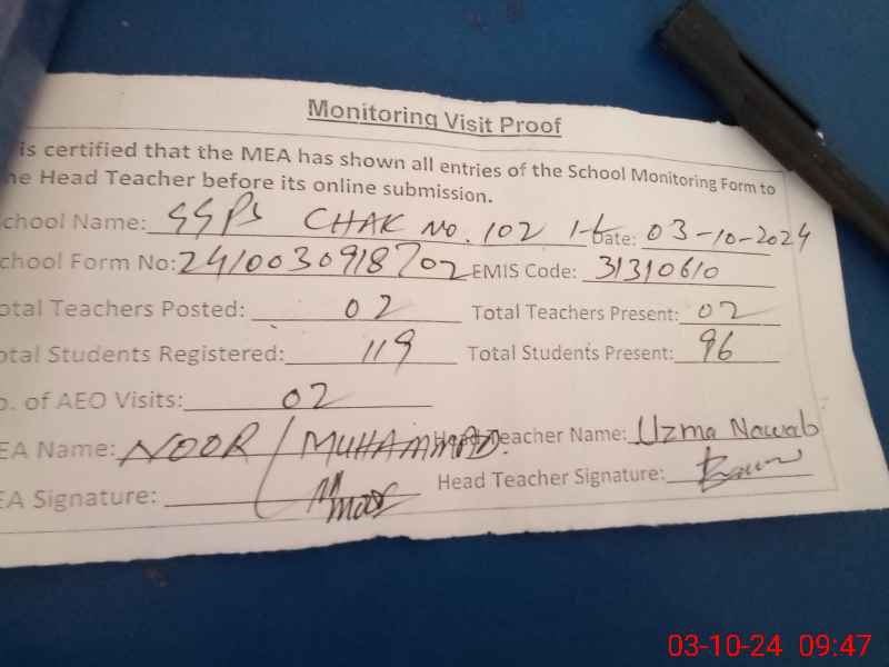 | EMIS Code: 31310610 | Name of School: GGPS CHAK NO 102/1-L | |||
