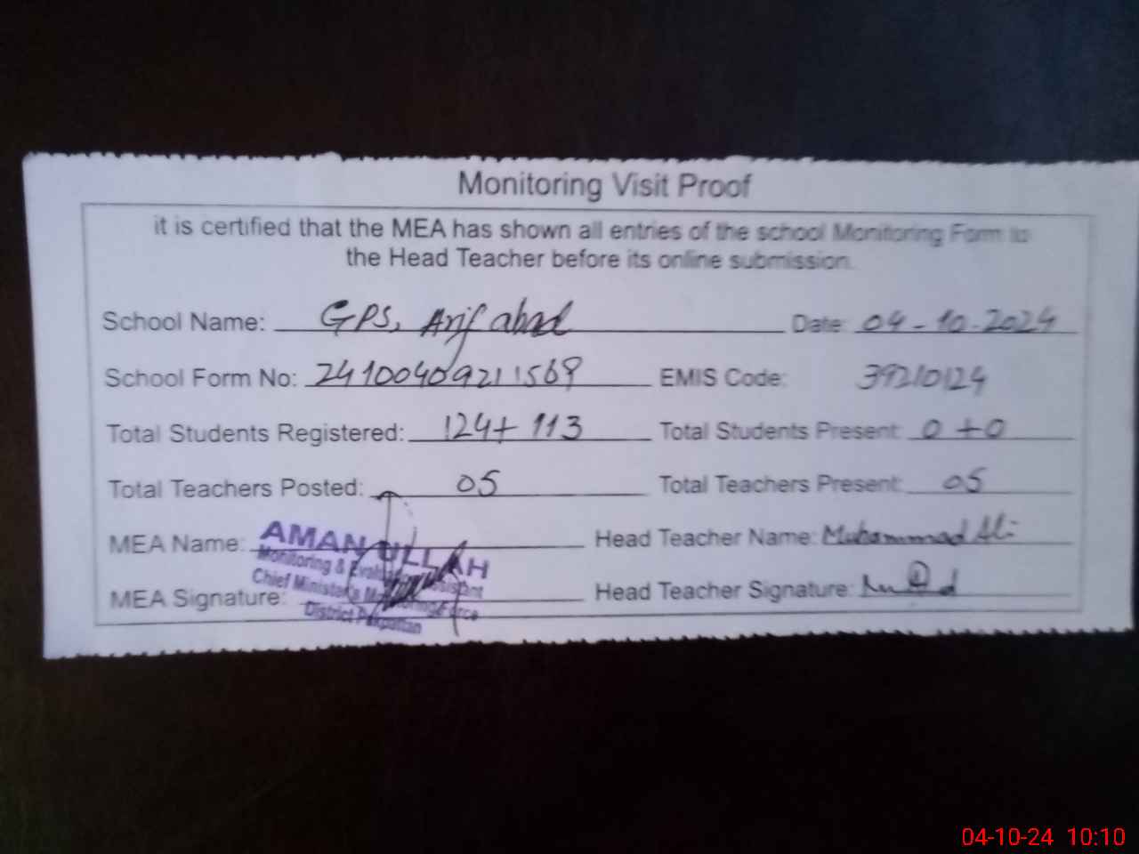 | Monitoring Date: 04-10-2024 | Start Time: 04-10-2024 09:21 AM | End Time: 04-10-2024 10:11 AM | Name of MEA: AM**** UL**** | |