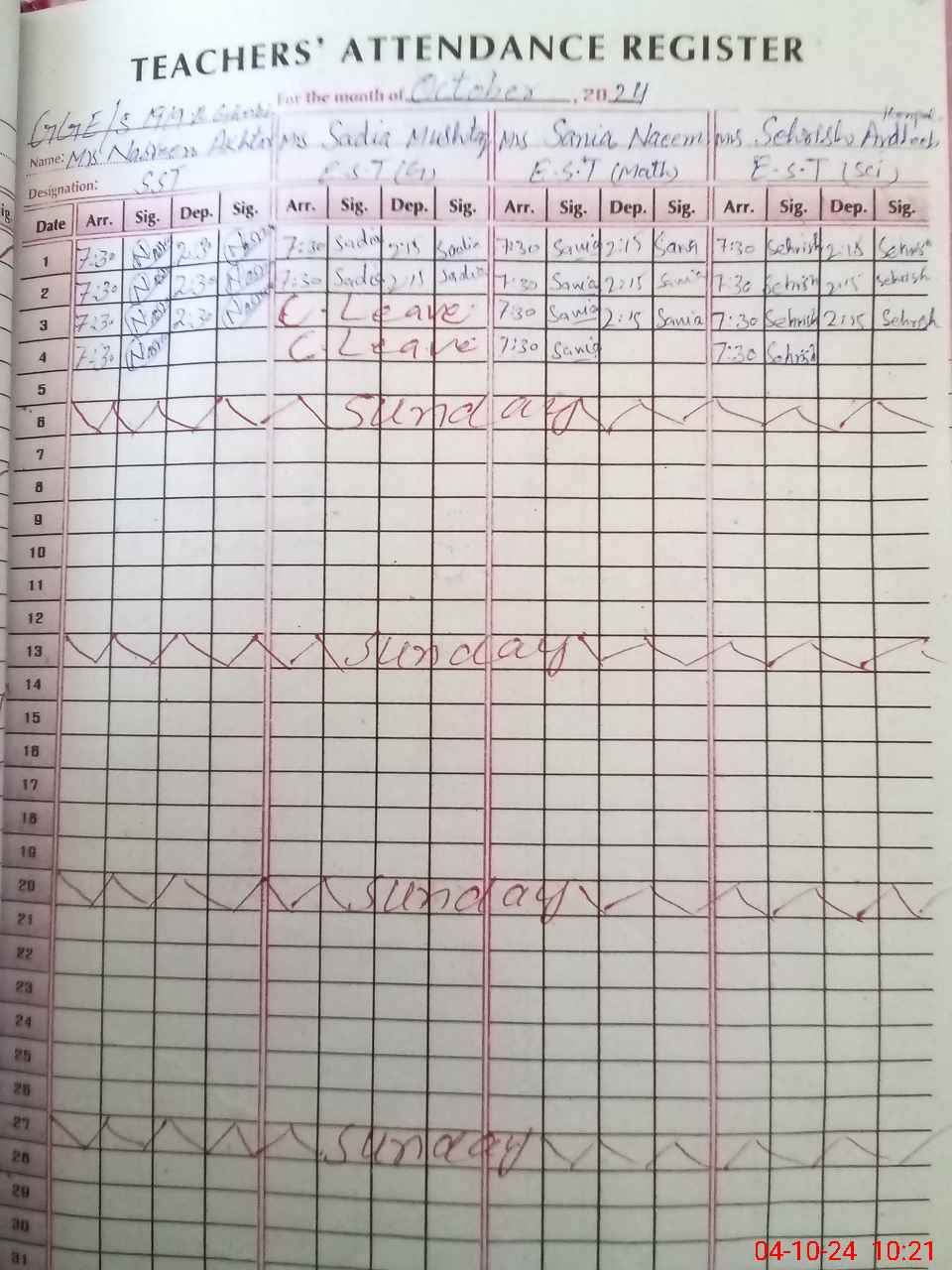 | Leave | Duty | Absent | Maternity | Medical | Ex- Pak |