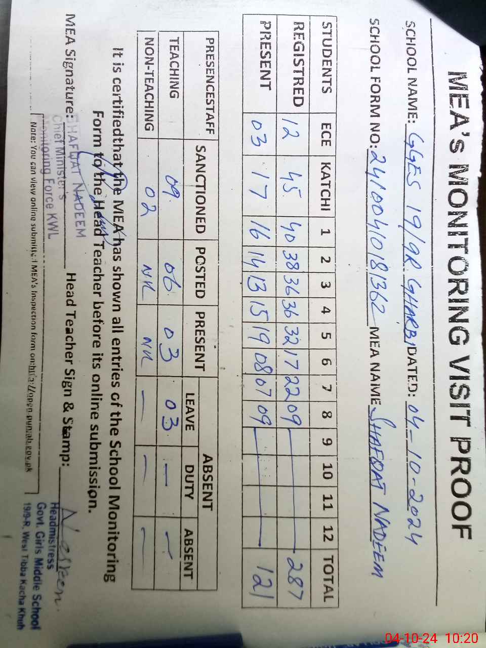 | Attendance Register | Head Teacher | MEA with School | Visit Proof |