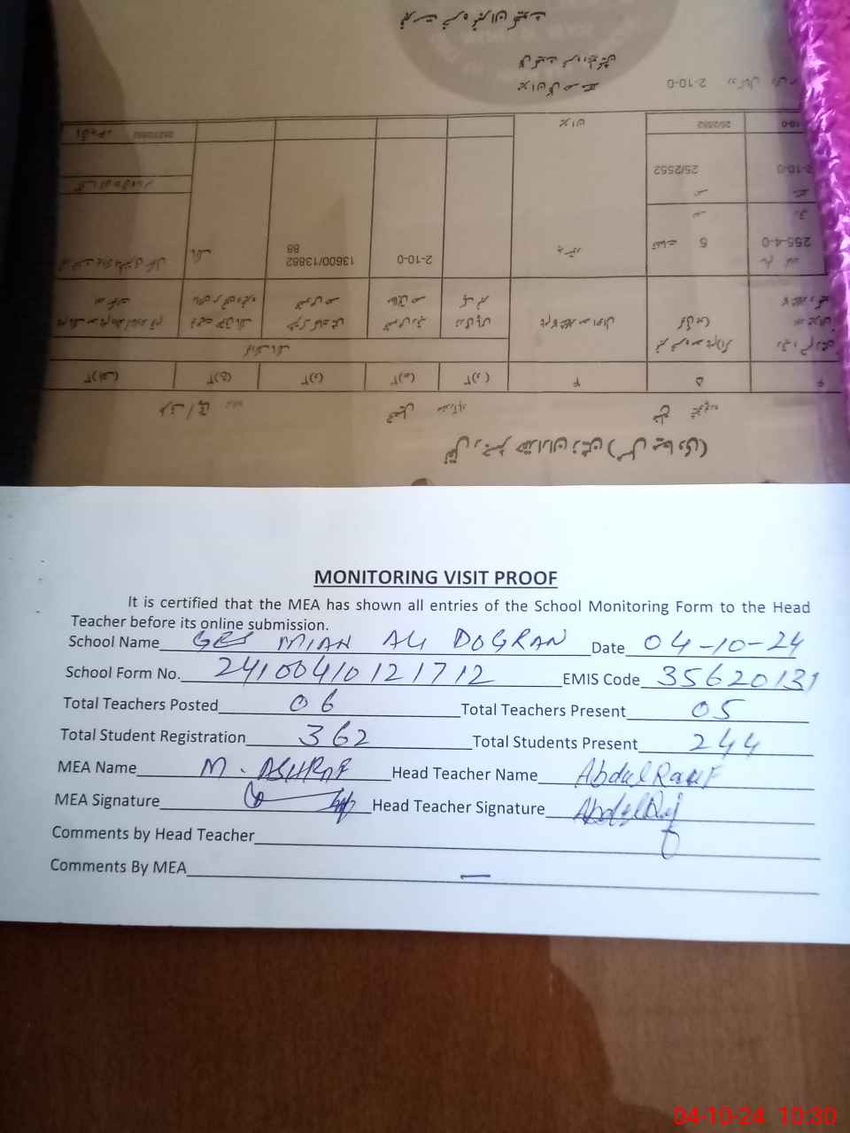 | Certified that this School was Inspected by the Undersigned MEA/DMO Today and the Information Stated Above is as Per Record. | |||||