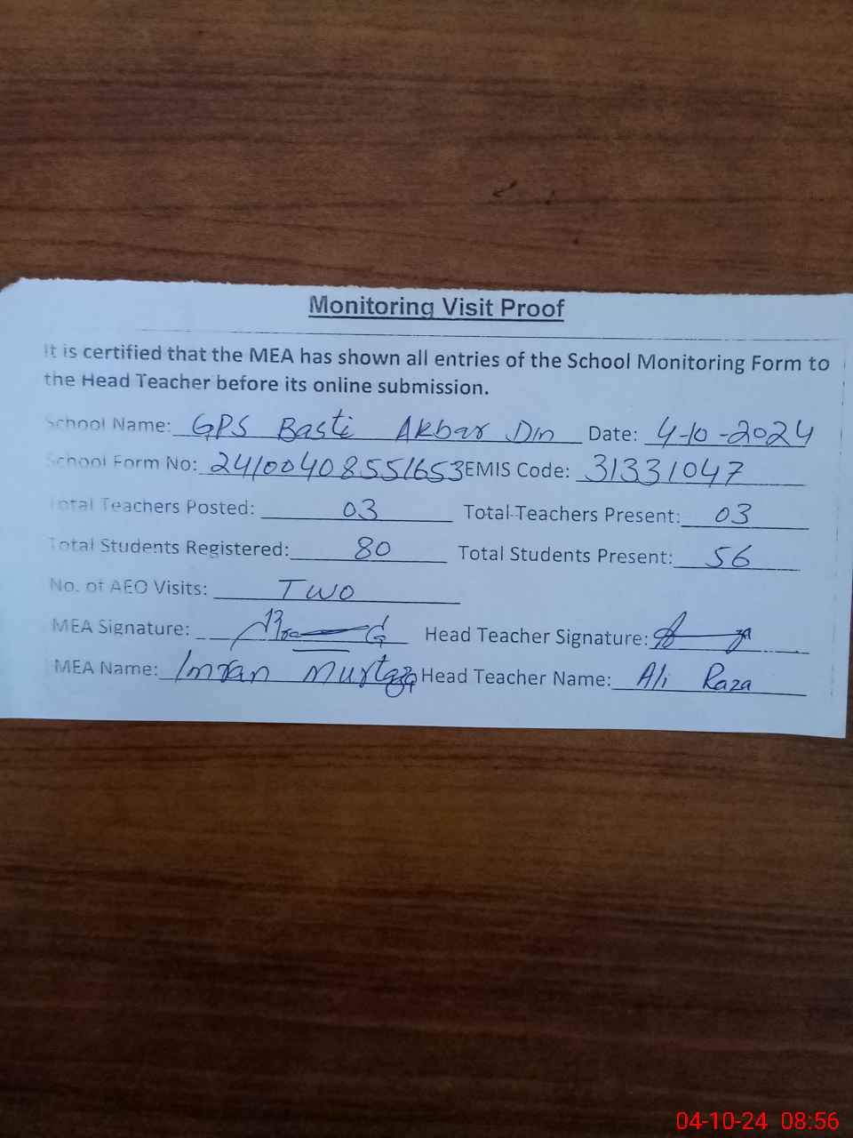| Attendance Register | Head Teacher | MEA with School | Visit Proof |