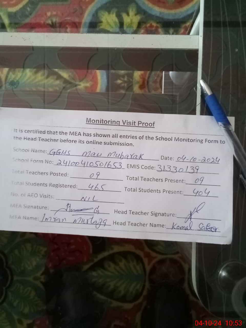 | Attendance Register | Head Teacher | MEA with School | Visit Proof |