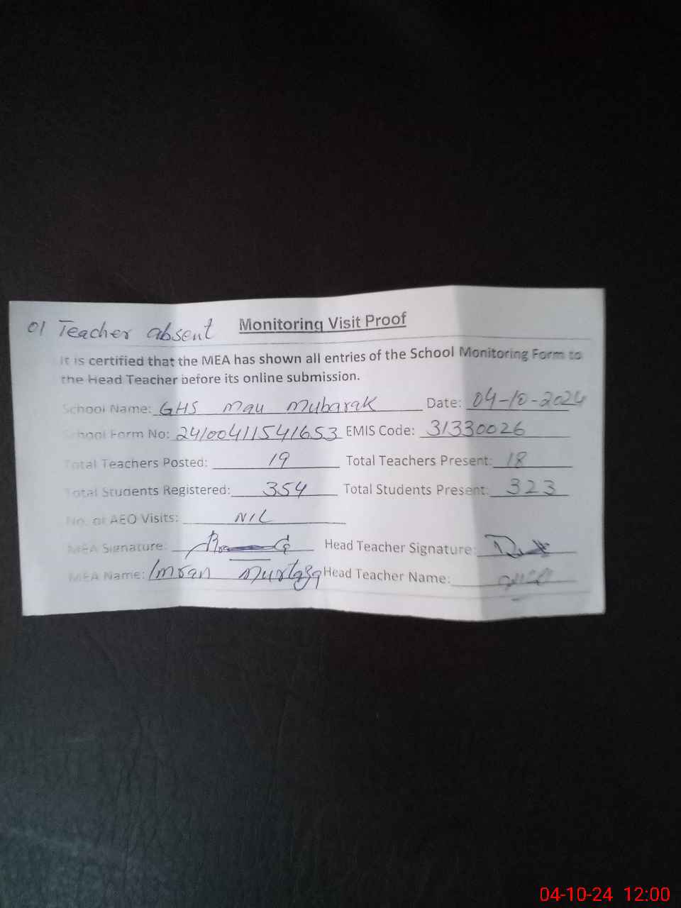 | EMIS Code: 31330026 | Name of School: GHS MAU MUBARAK | |||
