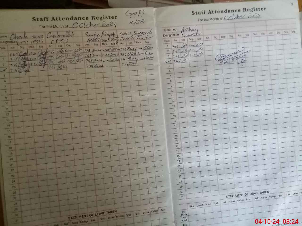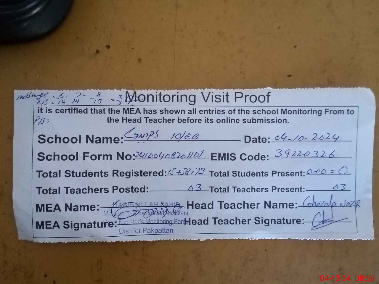 | Attendance Register | Head Teacher | MEA with School | Visit Proof |