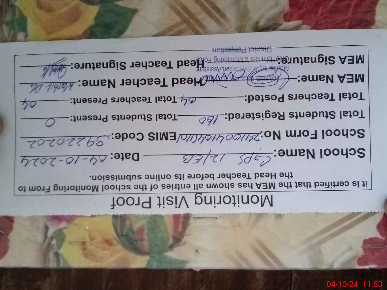 | Certified that this School was Inspected by the Undersigned MEA/DMO Today and the Information Stated Above is as Per Record. | |||||