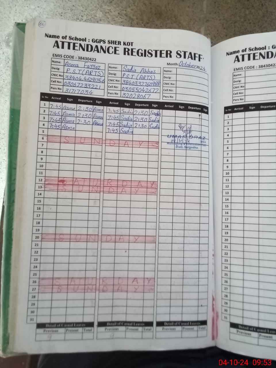 | Name: AS**** FA**** Designation: (School Headmaster's/Headmistress's) PST Phone/Cell Number: 03**** |