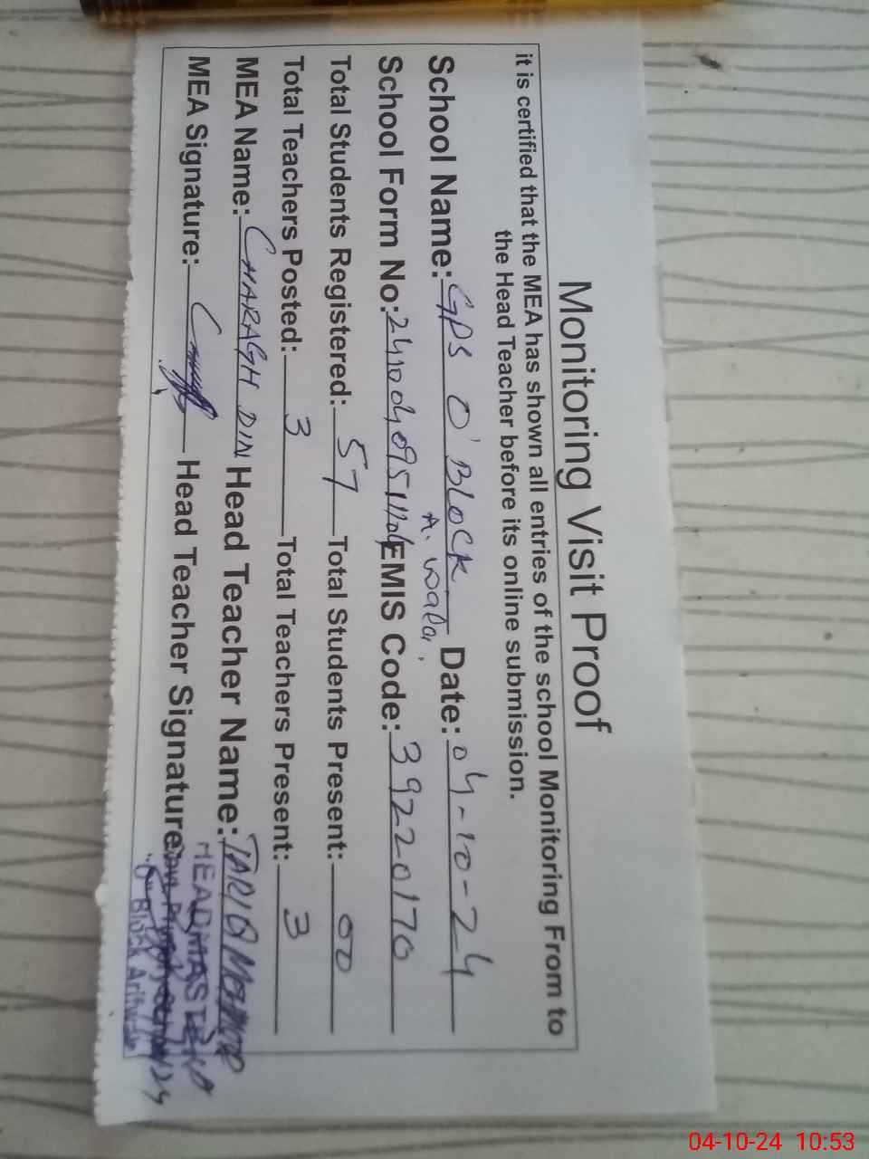 | Attendance Register | Head Teacher | MEA with School | Visit Proof |