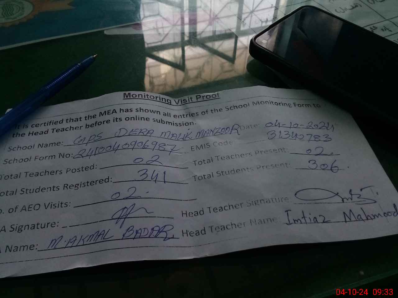 | Attendance Register | Head Teacher | MEA with School | Visit Proof |
