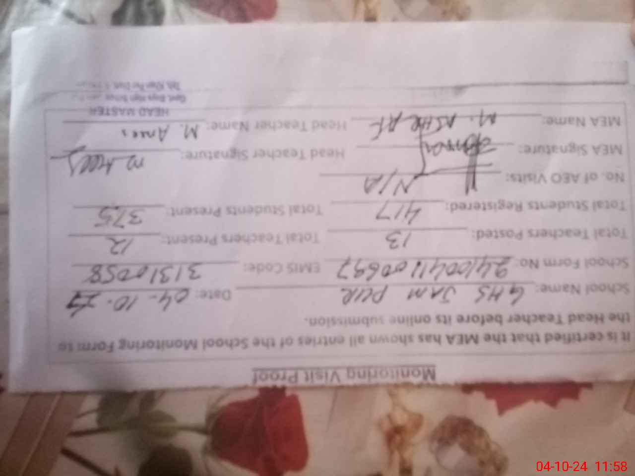 | Attendance Register | Head Teacher | MEA with School | Visit Proof |