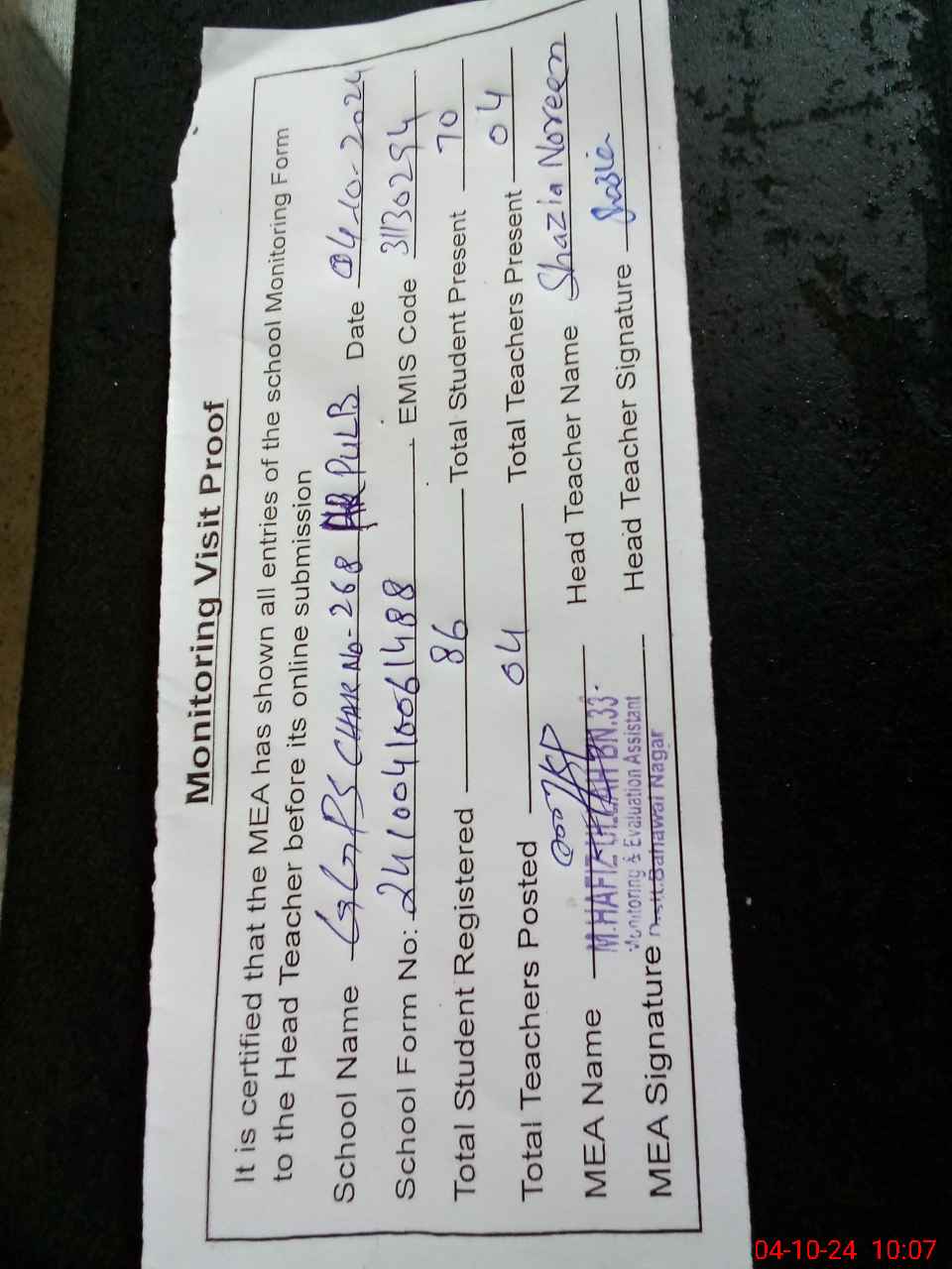 | Attendance Register | Head Teacher | MEA with School | Visit Proof |