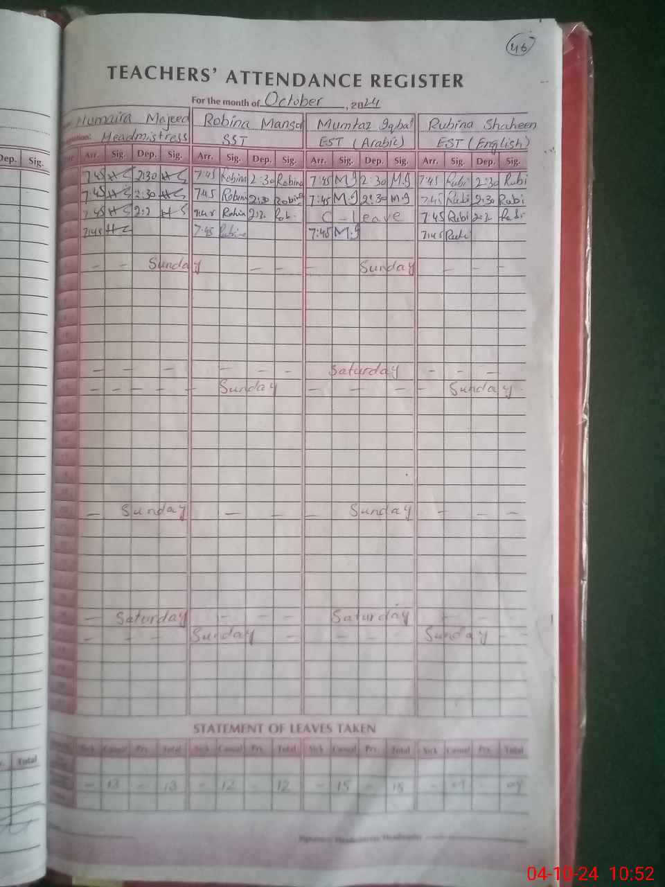 | Leave | Duty | Absent | Maternity | Medical | Ex- Pak |
