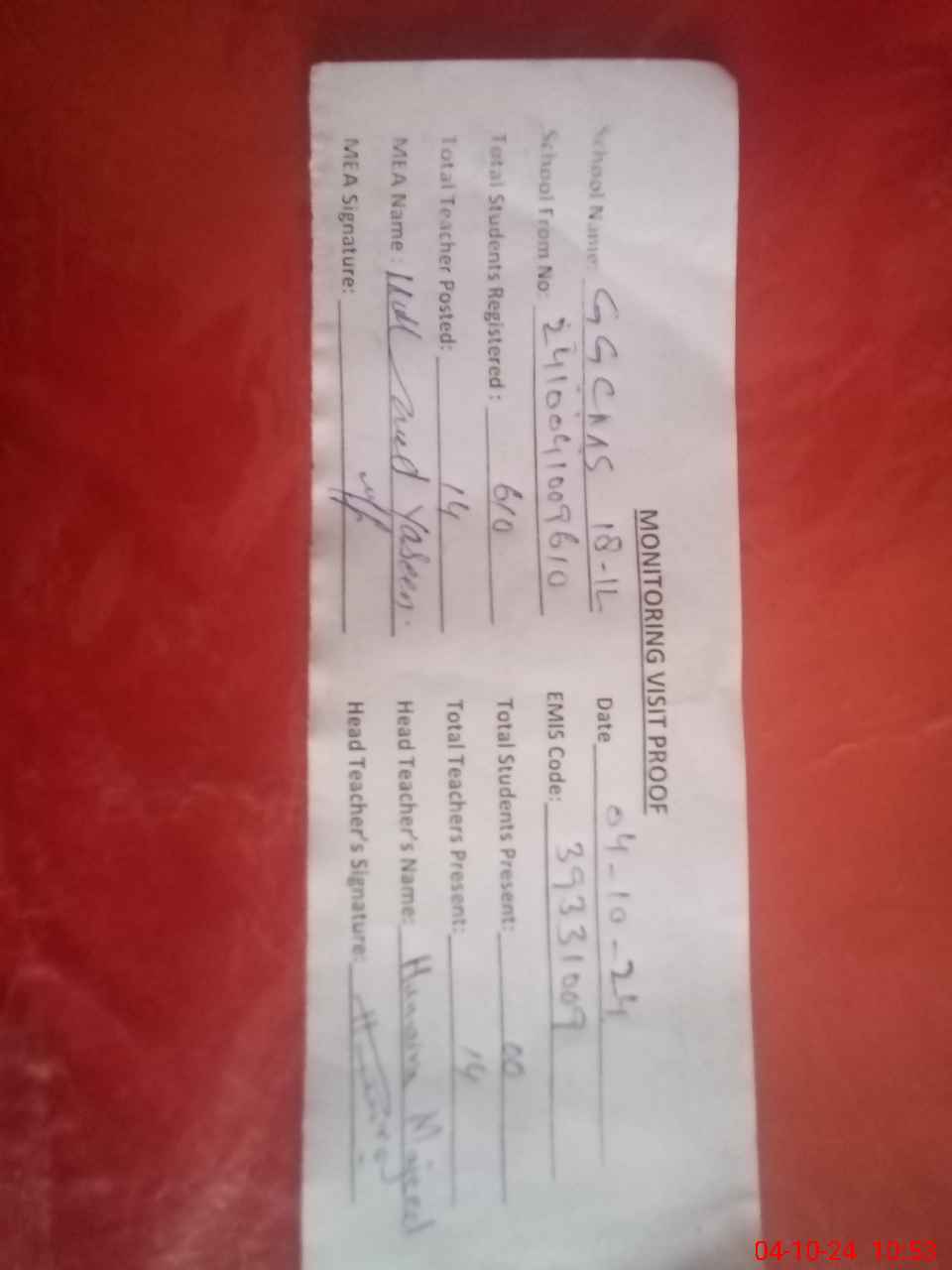 | Monitoring Date: 04-10-2024 | Start Time: 04-10-2024 10:09 AM | End Time: 04-10-2024 10:53 AM | Name of MEA: MU**** YA**** | |