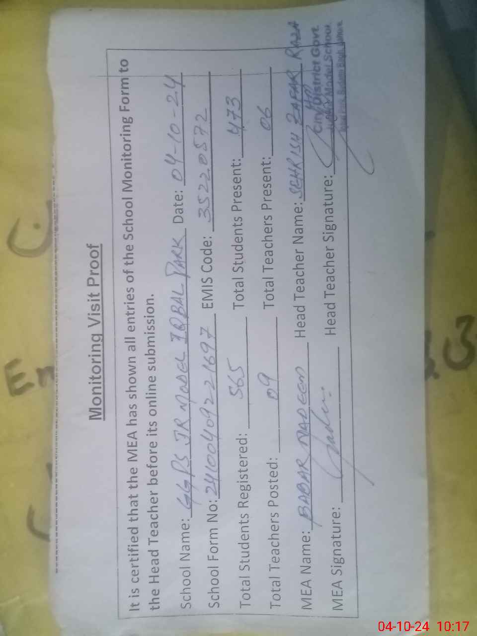 | EMIS Code: 35220572 | Name of School: GGPS JUNIOR MODEL IQBAL PARK | |||