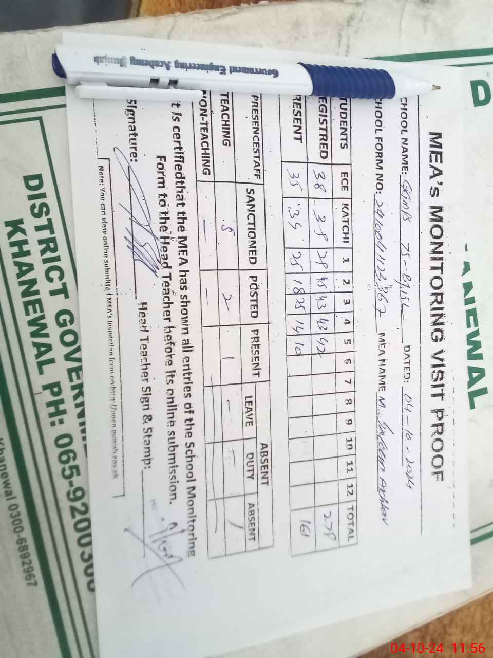 | Certified that this School was Inspected by the Undersigned MEA/DMO Today and the Information Stated Above is as Per Record. | |||||