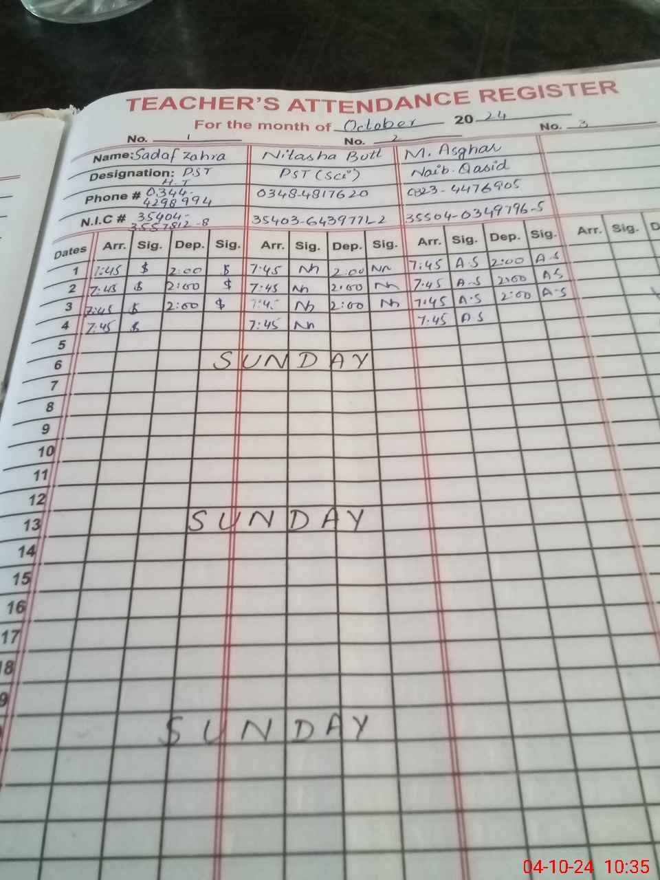| CNIC | Full Name | Designation | R/C | Absence during last cal. month |