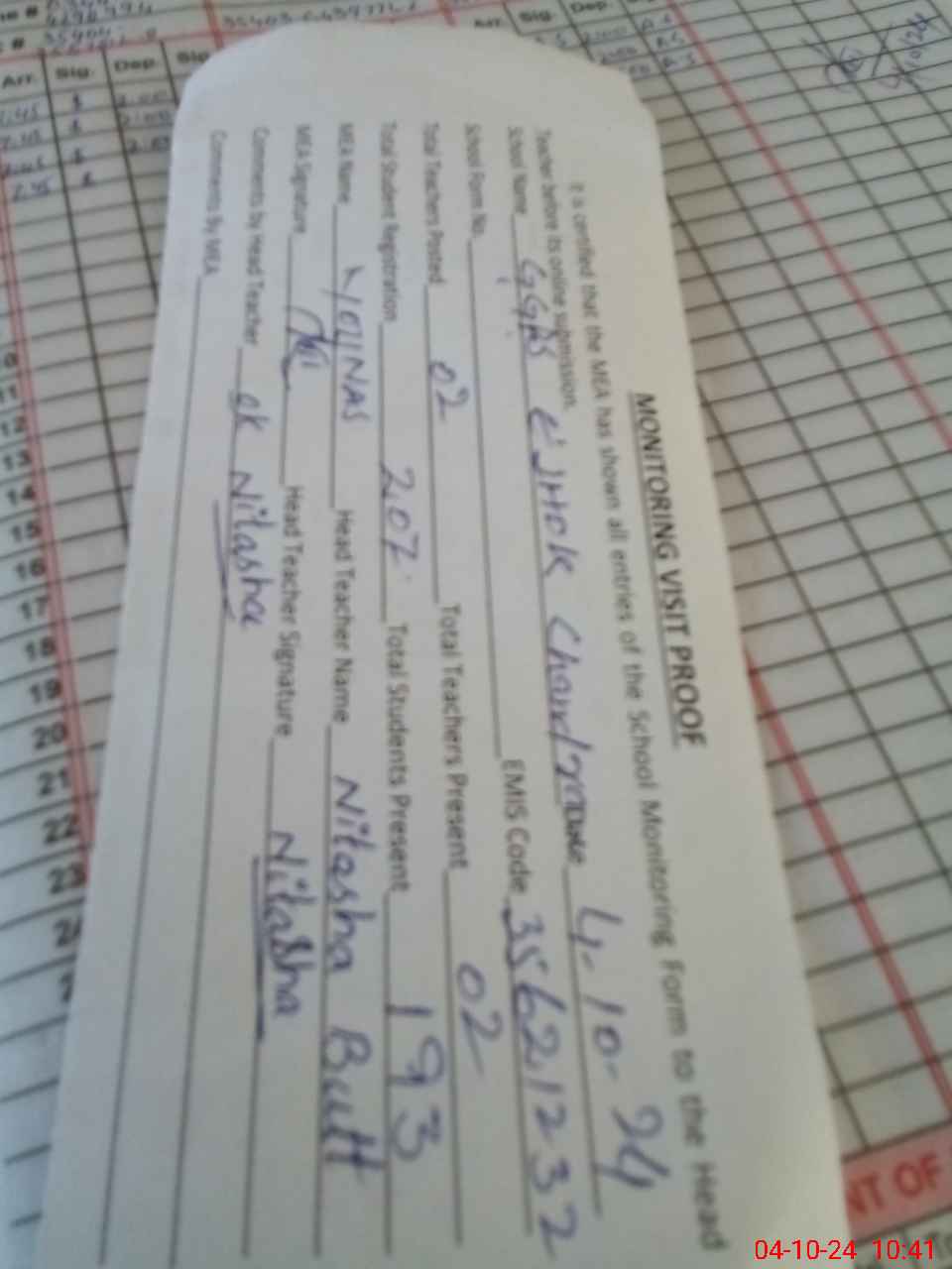 | Attendance Register | Head Teacher | MEA with School | Visit Proof |