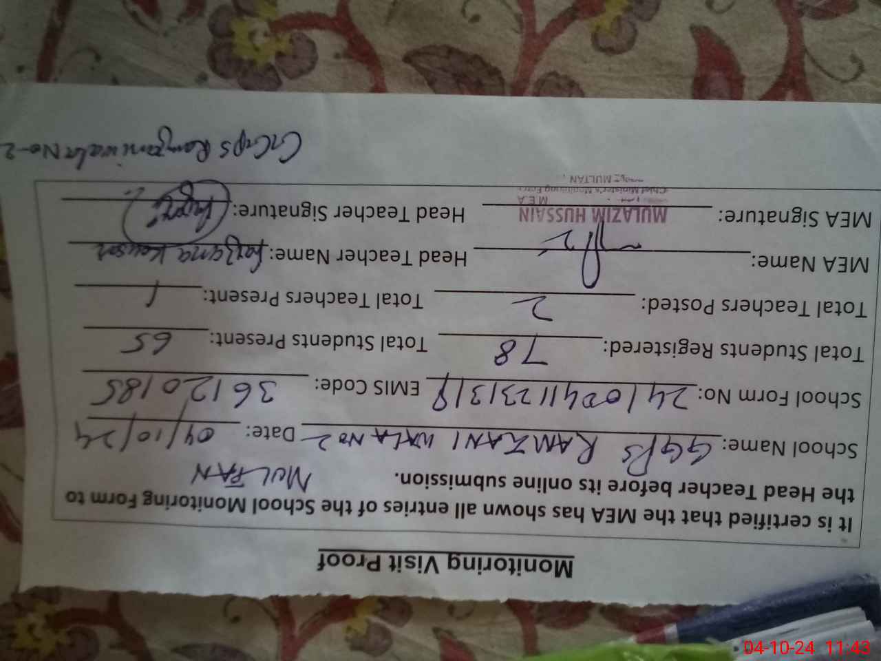 | Certified that this School was Inspected by the Undersigned MEA/DMO Today and the Information Stated Above is as Per Record. | |||||