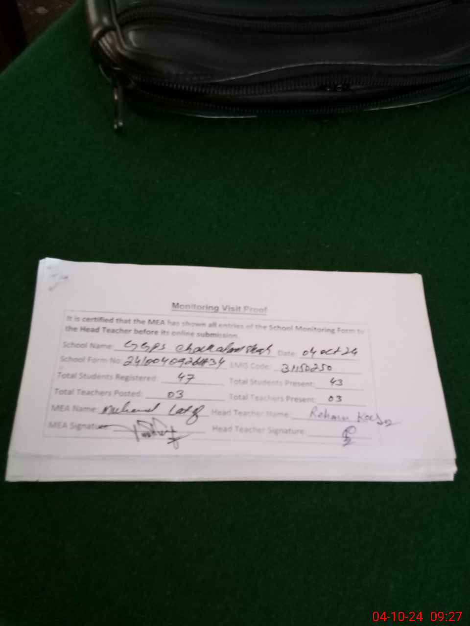| Attendance Register | Head Teacher | MEA with School | Visit Proof |