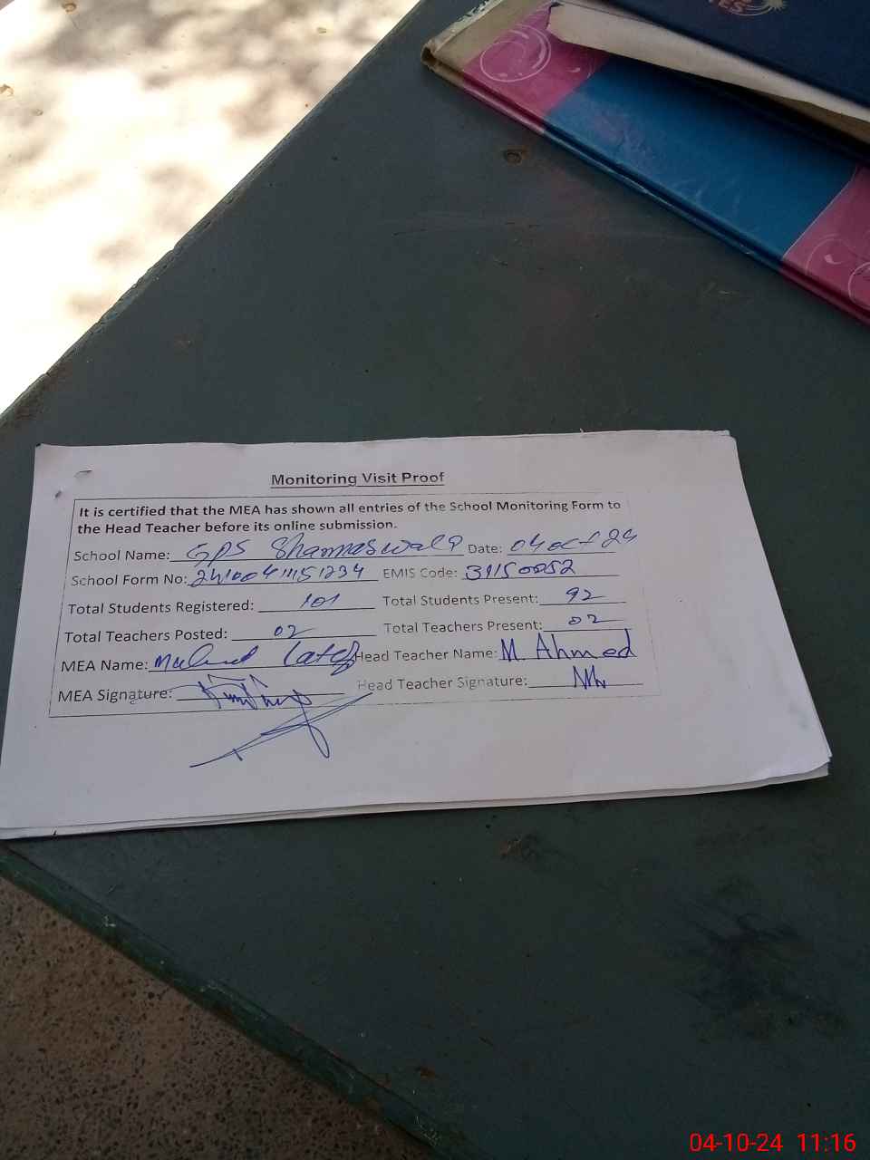 | EMIS Code: 31150052 | Name of School: GPS SHAMAS WALA | |||