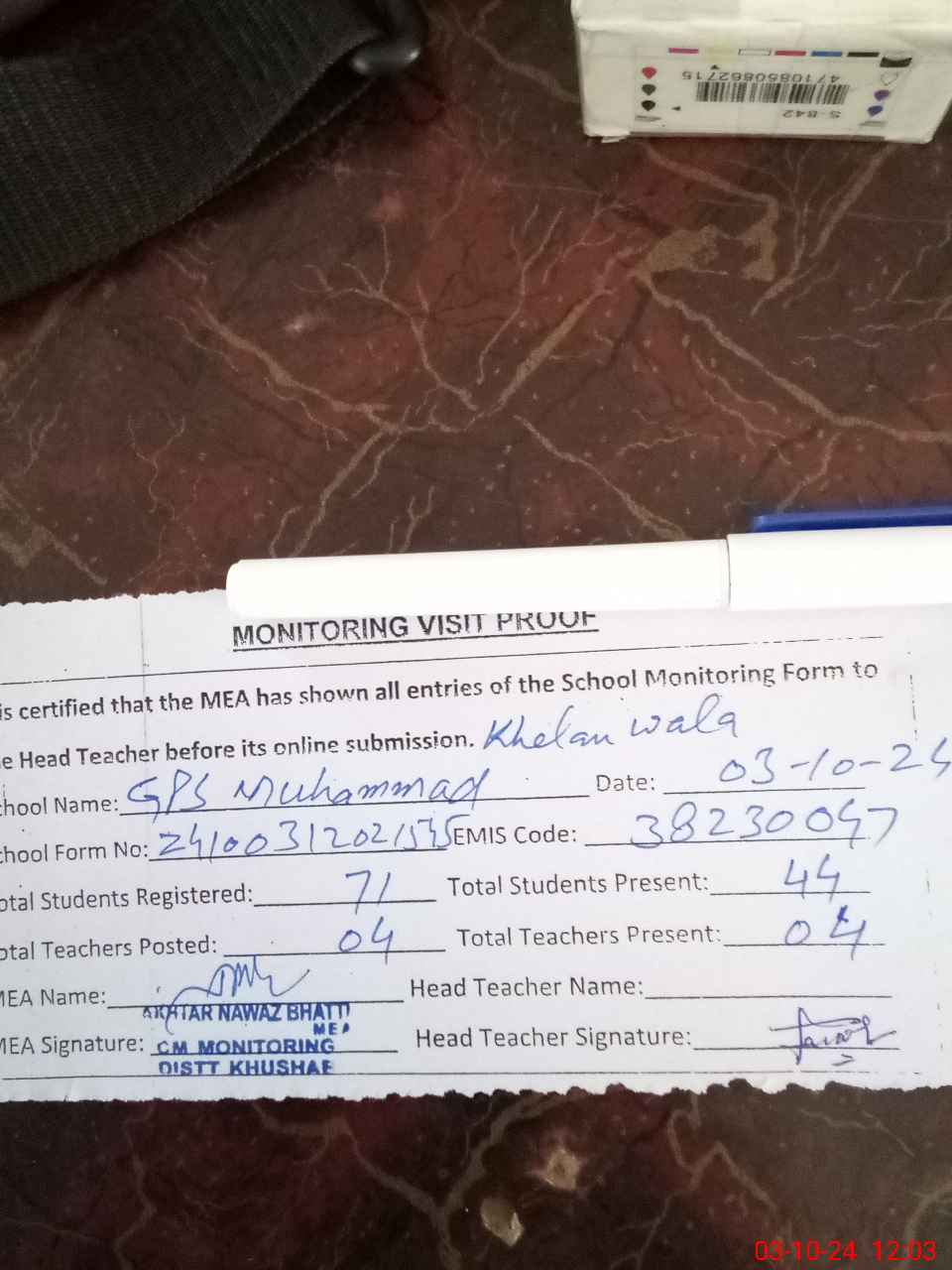 | EMIS Code: 38230047 | Name of School: GPS MUHAMMAD KHAILAN WALA BANDIAL | |||
