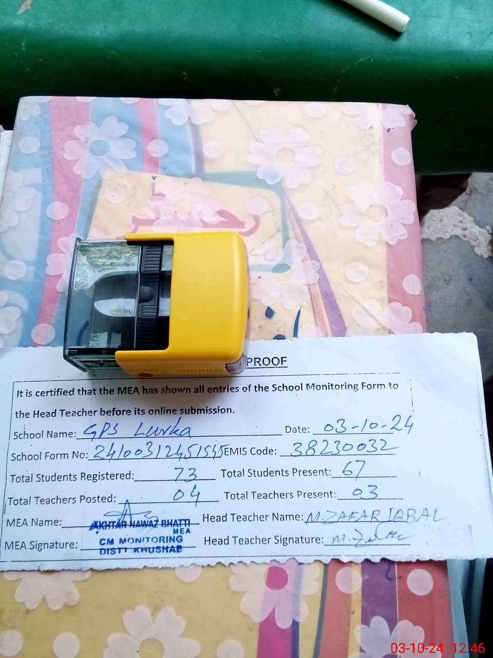 | Certified that this School was Inspected by the Undersigned MEA/DMO Today and the Information Stated Above is as Per Record. | |||||